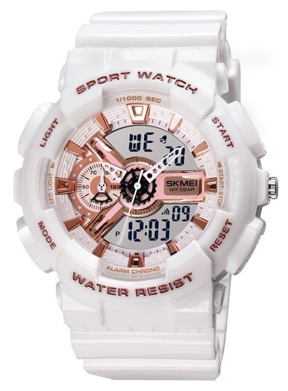 Solidny model o sportowym wyglądzie i białej kolorystyce. Posiada wyświetlacz cyfrowo-analogowy, z zielonymi sekcjami cyfrowymi oraz złoto-różowymi akcentami na elementach analogowych, co nadaje mu wyjątkowy styl. Idealny dla kobiet poszukujących wytrzymałego i funkcjonalnego zegarka sportowego o nowoczesnym designie.