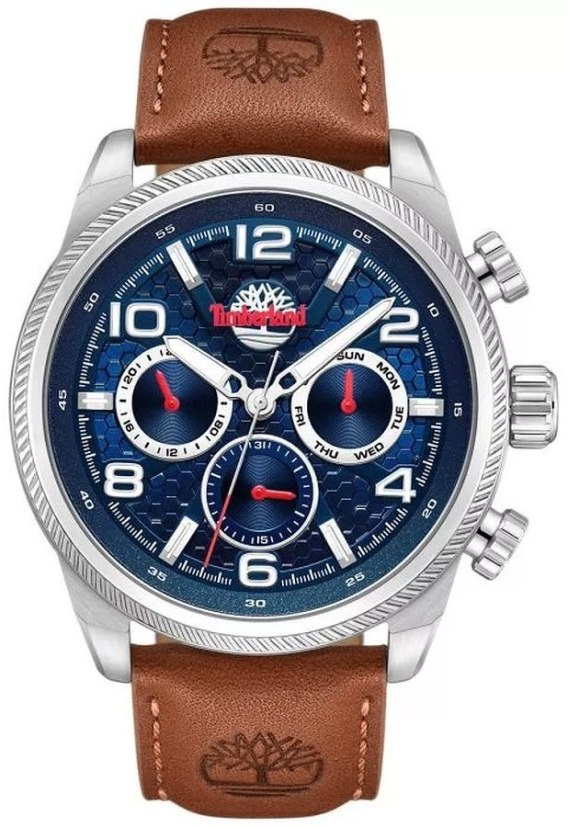 Zegarek osadzono na skórzanym pasku w ciepłym, brązowym odcieniu, który doskonale komponuje się z kolorystyką tarczy. Naturalna faktura skóry oraz tłoczone logo Timberland podkreślają autentyczność i outdoorowy styl, zapewniając jednocześnie wysoki komfort noszenia.