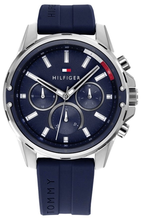 Wyrazisty model, który dumnie prezentuje kolory marki — głęboki granat oraz eleganckie akcenty w odcieniach czerwieni i bieli, nawiązując bezpośrednio do klasycznej palety kolorystycznej logo Tommy Hilfiger. Srebrna koperta z eleganckiej stali szlachetnej idealnie kontrastuje z głębokim metalicznym granatem tarczy, która przyciąga spojrzenie swoim wyrafinowaniem. Srebrno-białe indeksy i wskazówki w odcieniach czarno-srebrno-białym tworzą precyzyjny i dynamiczny design, a subtelny srebrny sekundnik dopełnia całości. Granatowy silikonowy pasek z unikalnymi czerwono-białymi akcentami z boku wprowadza sportowy akcent, idealnie wpisując się w casualowy, a zarazem wyrazisty charakter tego modelu.