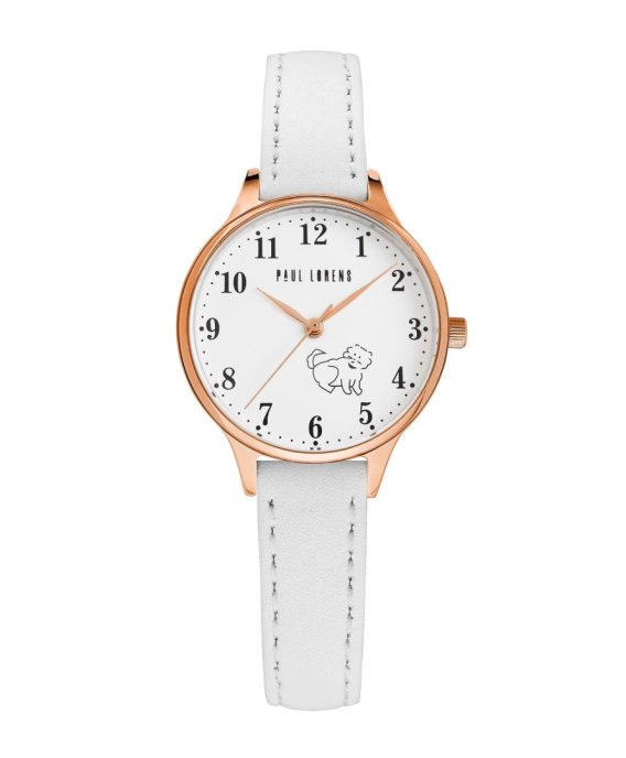 Koperta w kolorystyce różowego złota harmonijnie współgra z białą tarczą, na której widnieje uroczy wizerunek pieska, dodając zegarkowi radosnego charakteru. Ta subtelna grafika sprawia, że zegarek staje się wyjątkowym, osobistym akcesorium, które maluch będzie nosił z dumą.  Wskazówki i indeksy w różowym złocie dodają elegancji, a sprytnie zaprojektowany sekundnik, poruszający się z gracją, uczyni naukę odczytywania czasu przyjemnością i ekscytującą przygodą.