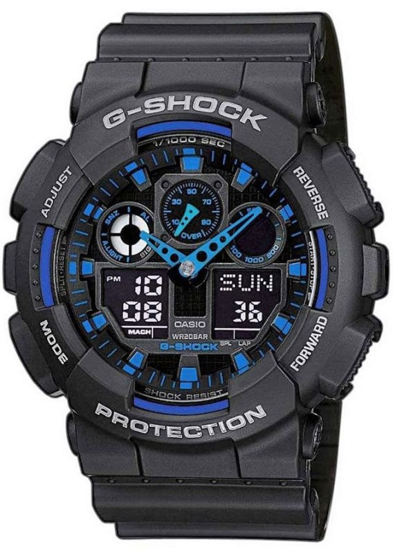Zegarek Męski CASIO G-SHOCK GA-100-1A2ER wyposażony jest w: Stoper, Alarmx5, Budzik. Data.. Podświetlenie - do podświetlenia tego zegarka użyto diody LED, która stonowanym i jasnym światłem wystarczająco naświetli nam tarczę. Czas światowy, odczyt różnych stref czasowych. Kalendarz automatyczny z zaprogramowanymi datami do 2099r., Zegarek sam dostosowuje daty w przypadku krótszych miesięcy. Timer 1/10 - sec. Zegarek wyposażony jest w funkcję liczącą czas do tyłu, możliwość ustawienia od 1 sec do 24 godzin.