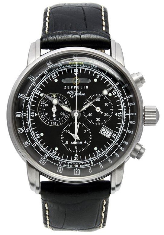 Zegarek lotniczy 100 Jahre Chronograph 7680-2 z limitowanej edycji powstałej, aby uczcić setną rocznicę istnienia legendarnej firmy Zeppelin. Ten wyjątkowy, jubileuszowy model dla mężczyzn wyróżnia się eleganckim czarnym designem, podkreślonym subtelnymi srebrnymi akcentami, które dodają mu wyrafinowanego charakteru. Zegarek wyposażony jest w funkcje takie jak chronograf do precyzyjnego pomiaru czasu, alarm, datownik, telemetr do mierzenia odległości na podstawie różnicy czasu między zjawiskami oraz tachometr.